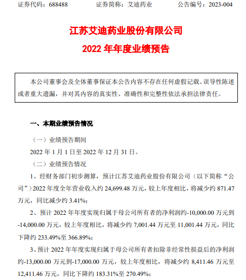 挖贝网1月20日,艾迪药业(688488)发布2022年年度业绩预告:预计公司2022年度全年营业收入约24,699.48万元,较上年度相比,将减少约871.47万元,同比减少约3.41%;