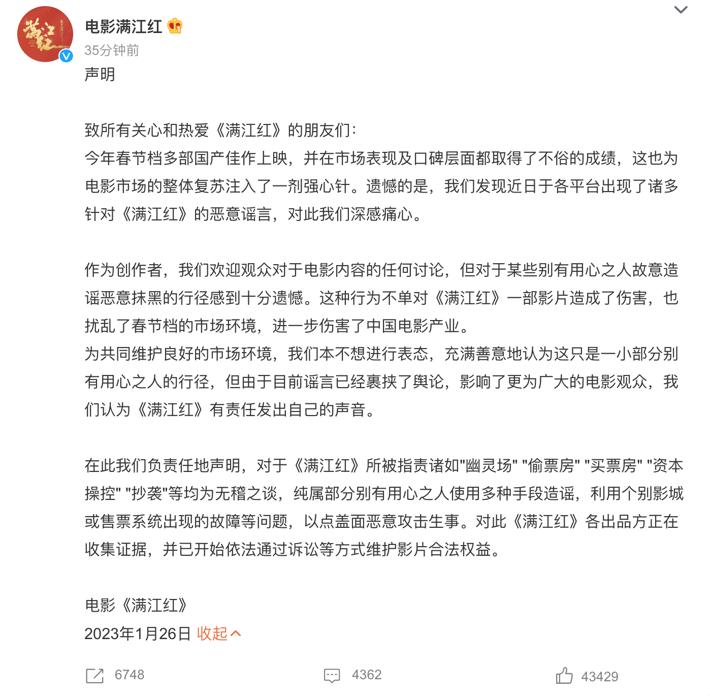 1月26日,电影《满江红》在其官方微博发布声明称,对于《满江红》所被指责诸如“幽灵场”“偷票房”“买票房”“资本操控”“抄袭”等均为无稽之谈,纯属造谣。