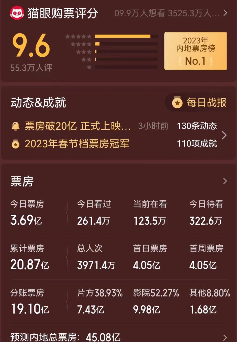 据了解,1月24日,《满江红》总票房反超《流浪地球2》,成为春节档第一。截至发稿,《满江红》总票房已破20亿元,《流浪地球2》总票房超18亿元。